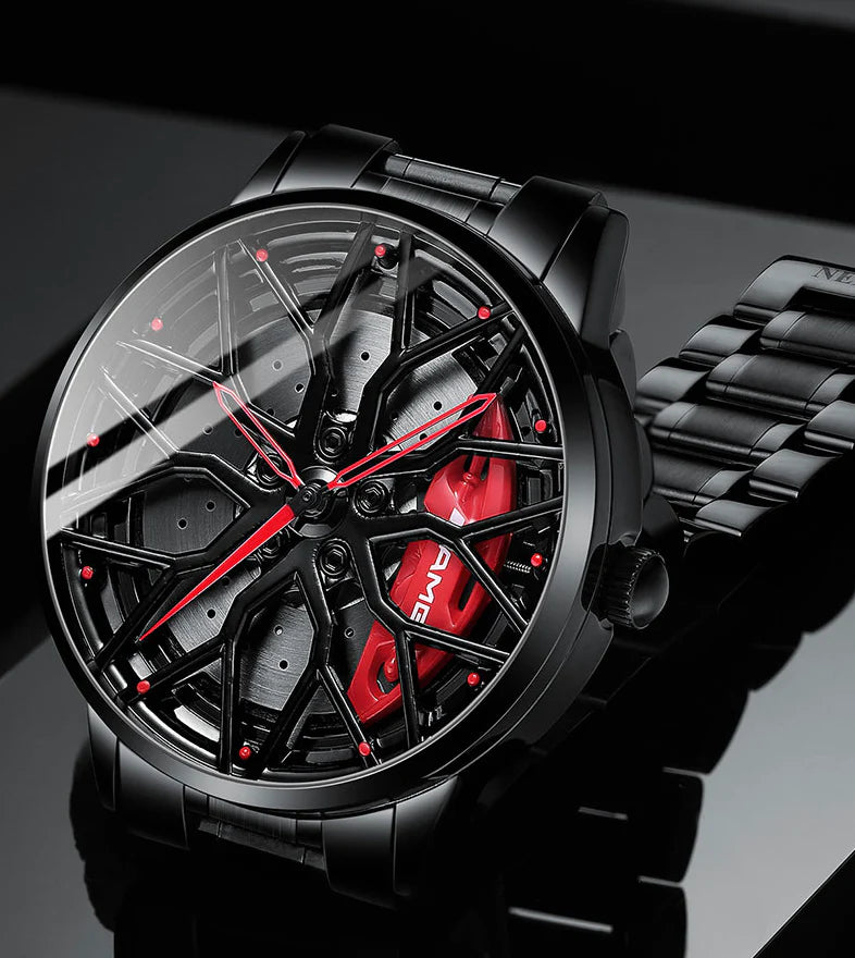 Ovaj sat ima upečatljiv izgled zahvaljujući svom dizajnu. Baziran na volanu trkaćeg automobila, prikazuje vrijeme na način koji je lako čitljiv. Elegantni sat s trkaćim kotačem je predmet koji bi svaki muškarac trebao imati, omogućujući mu da se istakne i upotpuni svaku odjevnu kombinaciju. Svojom jednostavnom, klasičnom i modernom estetikom, ovaj sat može nositi svaki muškarac uz svaku odjevnu kombinaciju.